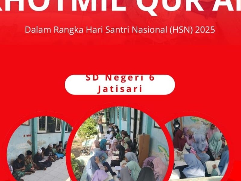 Dalam rangka memperingati Hari Santri Nasional tahun 2025, SDN 6 Jatisari mengadakan kegiatan Khotmil Qur’an yang dilaksanakan serentak pada jam pertama pembelajaran. Kegiatan ini dimulai sejak pagi hari dan dilaksanakan secara terpusat di depan kelas. Seluruh siswa, guru, dan tenaga kependidikan turut serta dalam kegiatan ini sebagai bentuk penghormatan terhadap perjuangan para santri dan ulama dalam menjaga nilai-nilai keislaman dan kebangsaan.
